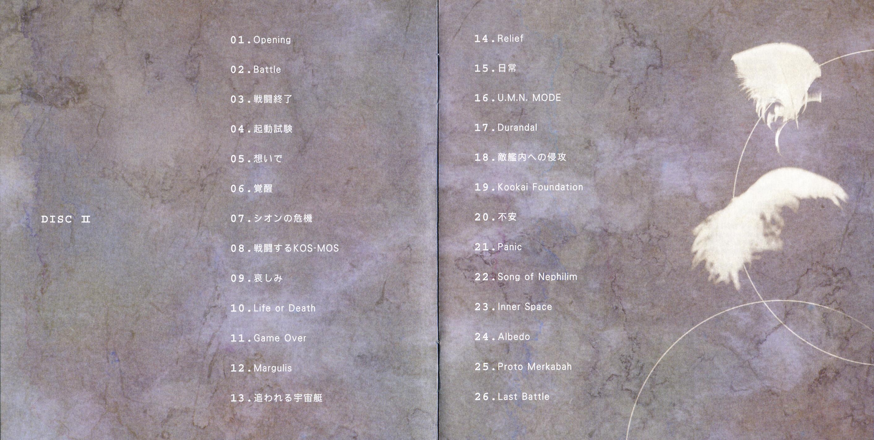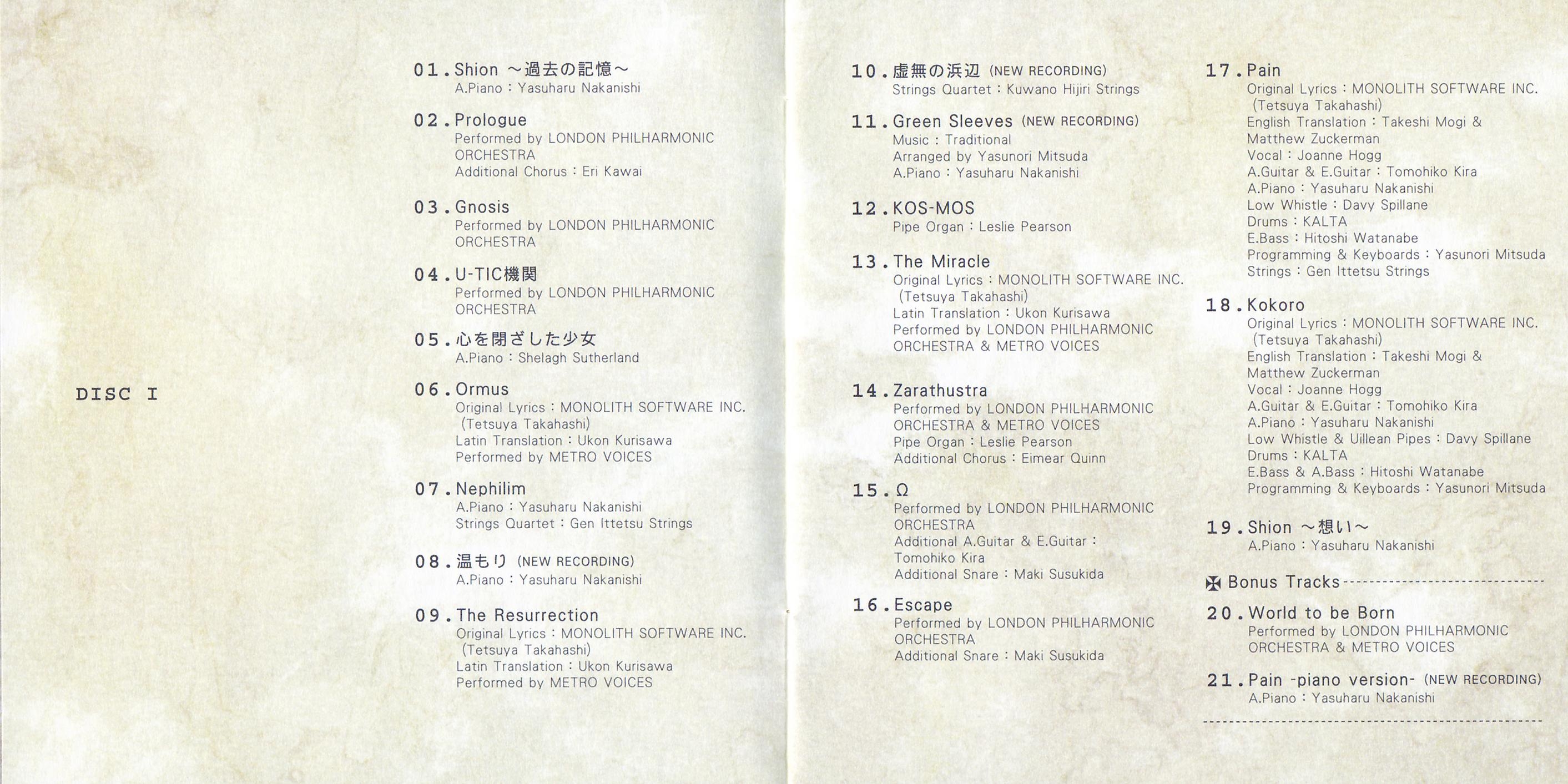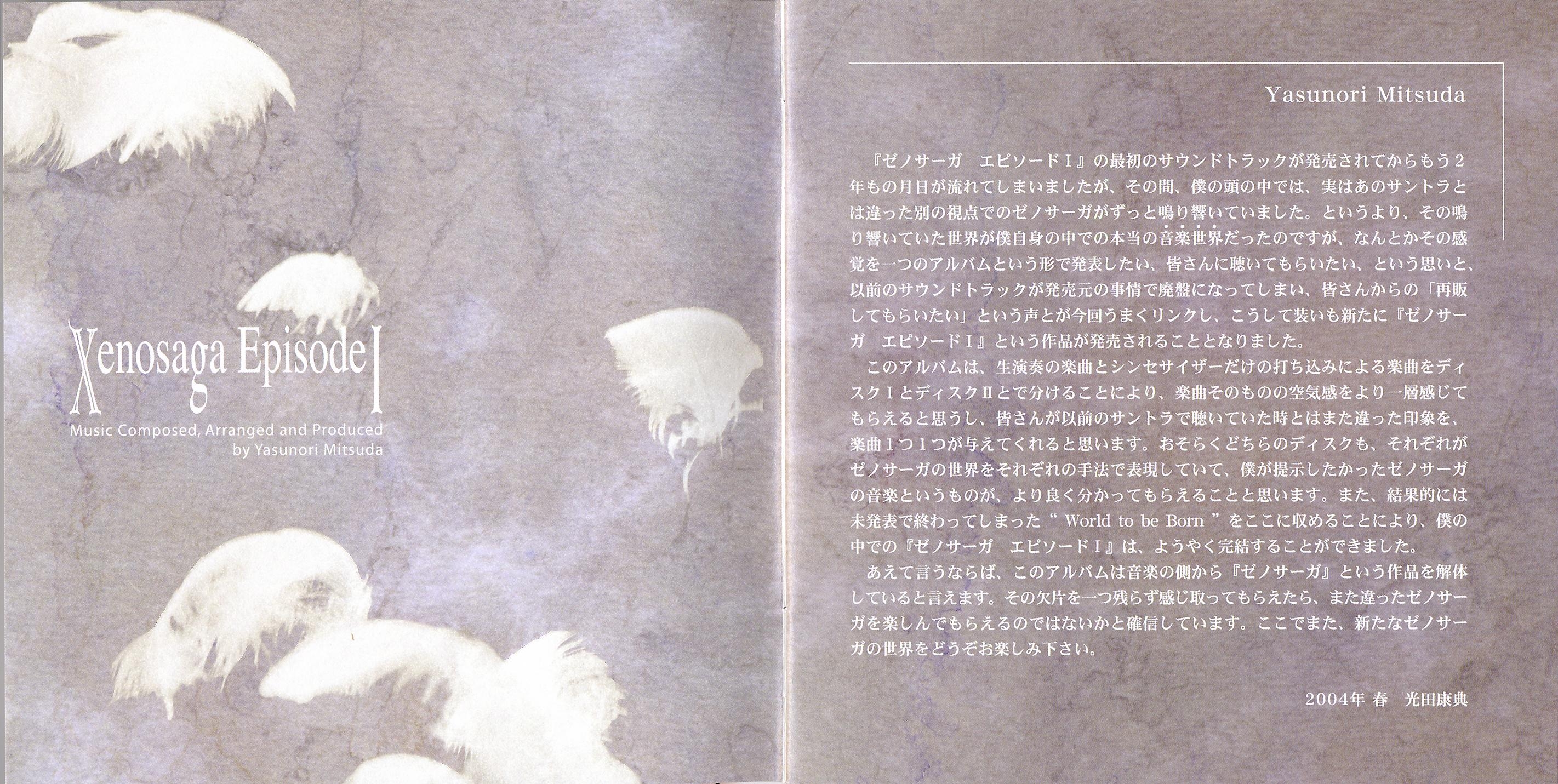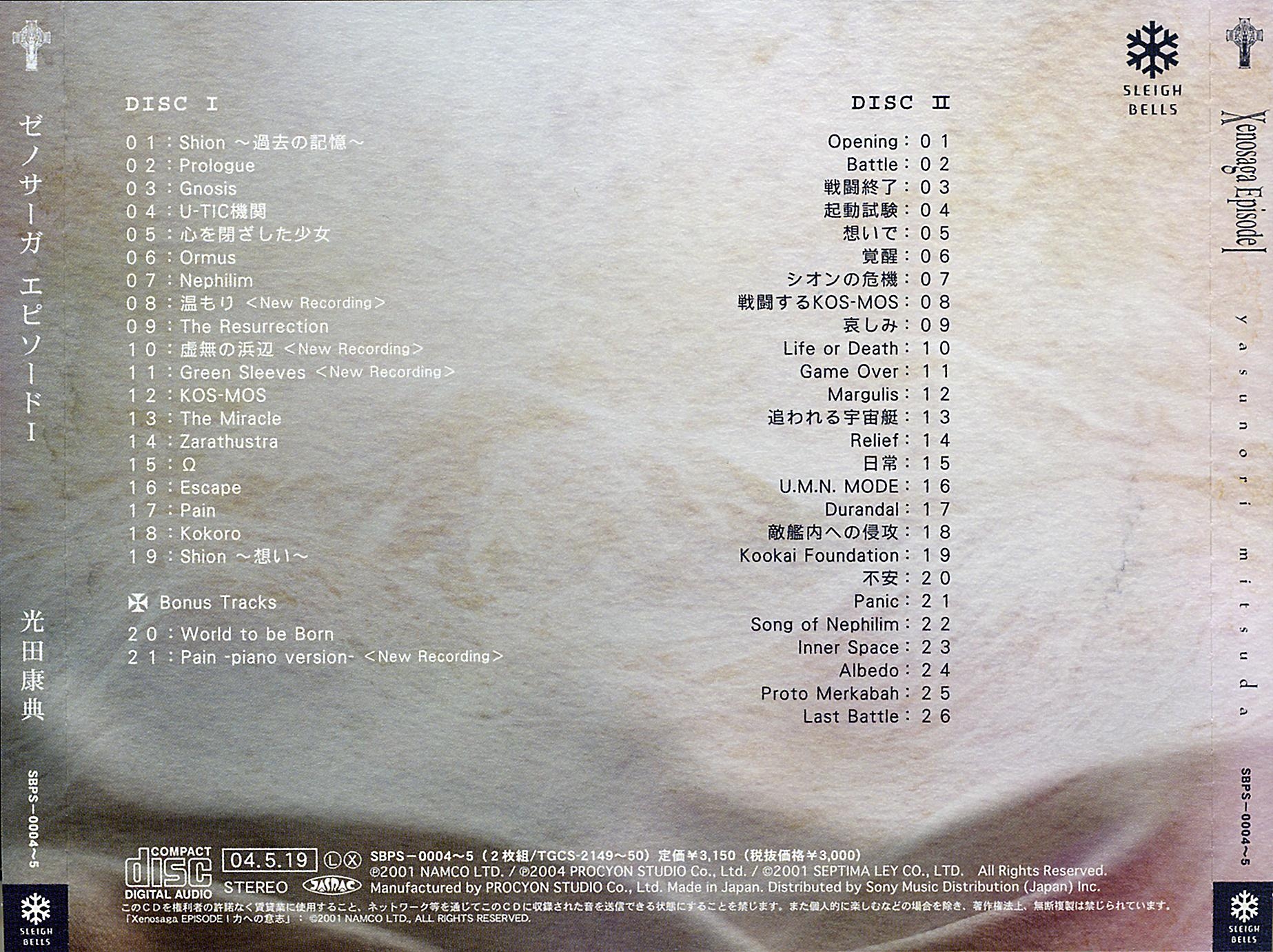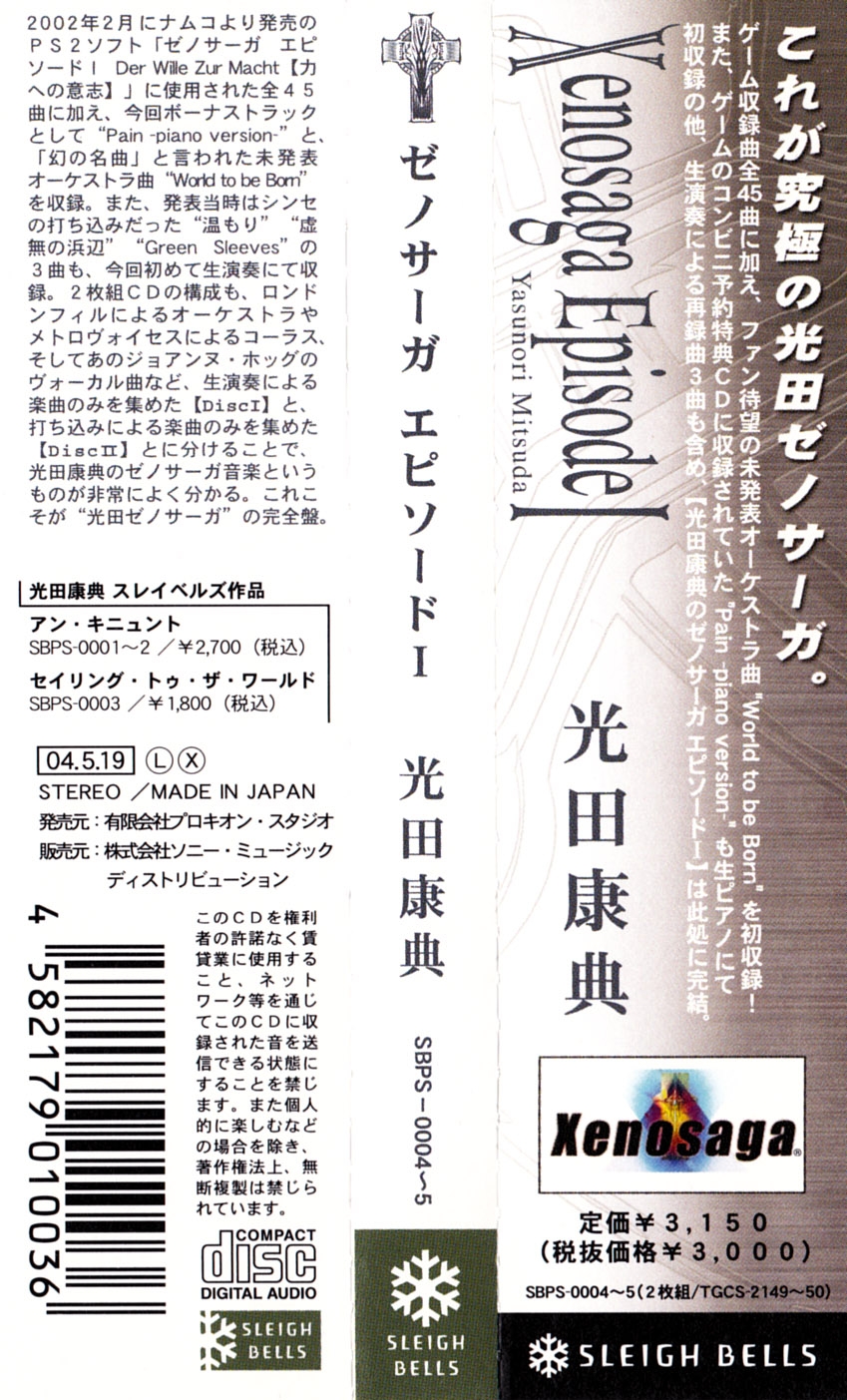 This is the second published version of the Xenosaga soundtrack. It contains new tracks that weren't on the original DigiCube version (SSCX-10062~3). Furthermore, it has new album art and a new tracklist order, and is remastered.