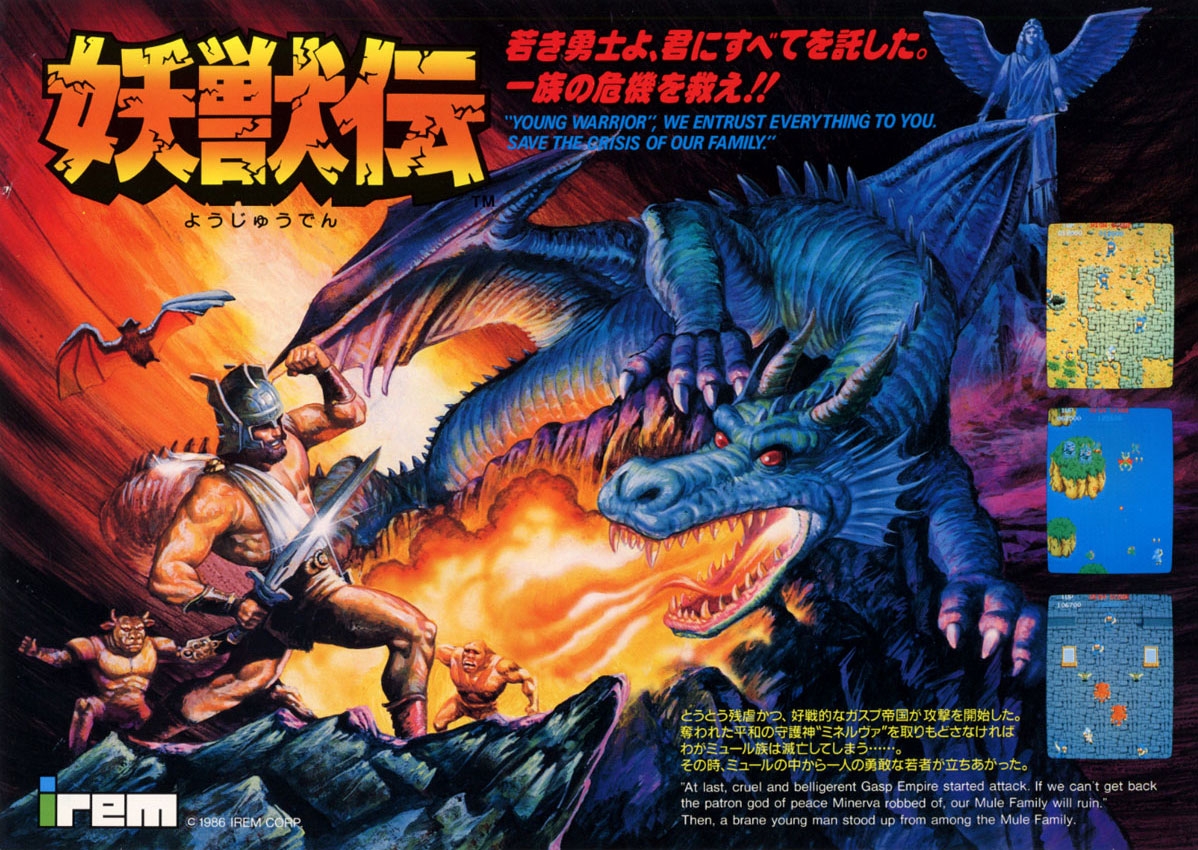 Yōjūden is a 2D top-down fantasy shooter, similar to Commando or Ninja Princess in an ancient land. The player controls a small, bearded man who wears a horned helmet, goes straight forward and shoots various enemies and bosses. He has unlimited bullets, but the weapon has a very limited range.